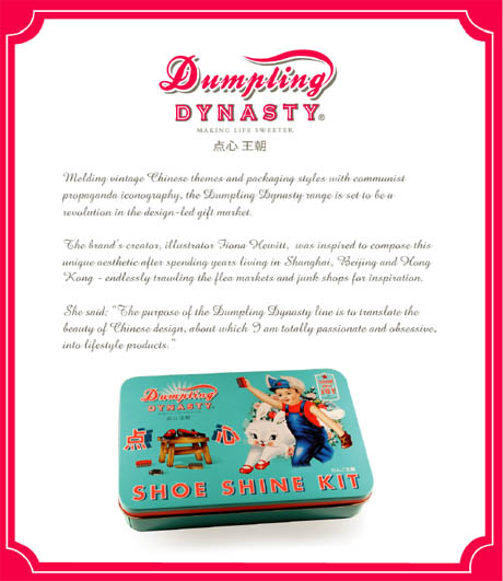 Sie beschreibt Dumpling Dynasty mit den folgenden Worten: "The purpose of Dumpling Dynasty line is to translate the beauty of Chinese Design, about which I am totally passionate and obsessive, into lifestyle products".