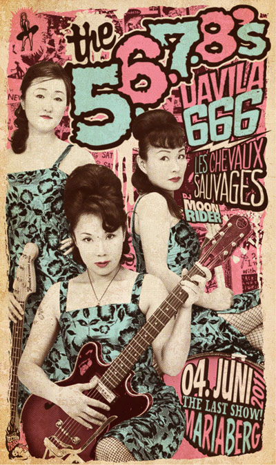 DAVILA 666Die abgefahrenen Puerto Ricaner sind auch mit von der Partie. Die lassen die Bohnen im Chili grooven. Das Sextett zwängt sich für euch in schmutzige El Mariachi Streetgang Leatherjäckle und dies riecht stark nach Schweiss, Sex und RīnīR. Ihr Sound klingt wie eine Mischung aus Radio Birdman, early Stones, Jesus and the Mary Chain und Dead Boys (im Cheesy-Jangle-Pop Universum).The 5.6.7.8'sDie 3 Japanerinen von The 5.6.7.8's sind beeinflusst vom klassischen Rock 'n' Roll, Rockabilly, Surfsound, 60s-Trash, Punk sowie Psychobilly, ähnlich wie The Cramps schufen sie ihren eigenen musikalischen Kosmos aus Teenage Drama und B-Movies, was sich in Titeln wie I Was a Teenage Cave Woman, Motor Cycle Go-Go-Go oder My Boyfriend from Outer Space niederschlägt. Der Name der Gruppe bezieht sich darauf, dass die Band sich das Beste aus den 50ern bis 80ern in ihre Musik einverleibt. The 5.6.7.8's erweisen sich als klassische Single-Band. Erst grad im März dieses Jahres erschien ihre letzte Single mit dem Namen SHO-JO-JI. Grössere Aufmerksamkeit in unseren Breitengraden erhielt die Gruppe erst, alsDies ist ihre allerletzte Tour, danach werden sie sich auflösen, also seit READY für einen Anlass mit Erdbebenstärke 5.6.7.8.