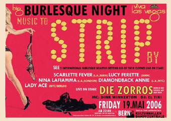BERN: BIG BURLESQUE NIGHT 'viva las vegas’Freitag, 19. Mai 2006Ca. 60 Jahre nach den Anfängen ist es wieder soweit: Exotische Schönheiten lassen gekonnt und mit allen Wassern gewaschen ihre Hüllen fallen.. nicht einfach so, mit viel Style und Charme Tanzen Scarlette Fever (L.A./Bern) Lucy Ferette (Bern/Bern), Nina LaFiamma (L.A./London), Diamondback Annie (L.A./NYC), LADY ACE (L.A/USA) zu wildem Rock’n’Roll den Cat Walk hinunter und