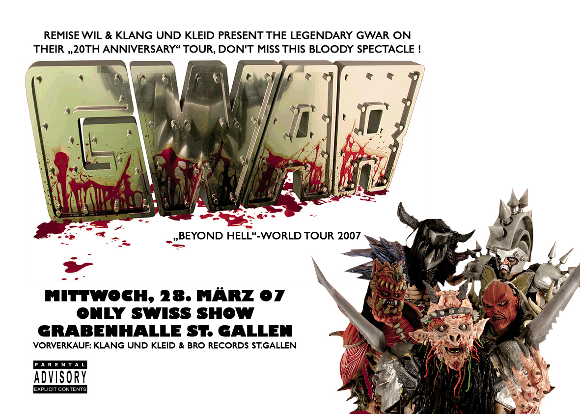 PresseAnlass: GWAR - Beyond Hell Tour 2007Typ: Konzert, Splatter / Monster-Show Musikstil: Heavy Metal Datum: Mittwoch, 28. März 2007 Ort: Grabenhalle, St.Gallen, Schweiz Vorverkauf: Klang und Kleid, St.Gallen & BRO Records, St.Gallen Spezielles: Regenpellerine oder weisses T-Shirt mitnehmen :) Nachfolgend einige der Bilder der GWAR für die Verwendung in der Berichterstattung über den Anlass vom Mittwoch, 28. März 2007. GWAR BilderWerden in Kürze hier publiziert.