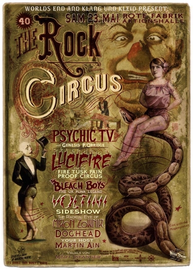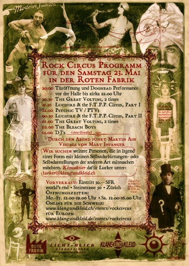 ![]() Grossansicht | Plakat kaufen Samstag, 23. Mai - Aktionshalle Rote FabrikAm 23. Mai 2009 ging in der Aktionshalle der Roten Fabrik zum 40. Geburtstag von ROCK aka Terror und für das zehnjährige Bestehen seines Piercing & Tattoo Studios World's End in Zürich www.worldsend.ch ein Anlass der Superlative über die Bühne. Viele von Euch kennen Rock persönlich oder er ist Euch ein Begriff. Das Worlds End und Klang und Kleid organisierten mit Hilfe der Roten Fabrik eine Party, die in dieser Form noch nie in der Schweiz stattgefunden hatte.Bei ausverkauftem Haus wurde mit dem "Rock Circus" gefeiert. Es erwartete euch eine geballte Ladung Rock n Roll, Grotesk Burlesque, Freakshows der traditionellen als auch der anderen abArt.